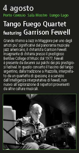 Il 4 agosto Jazz in Maggiore fa tappa sul Ceresio, con il grande ritorno di uno degli artisti piu’ significativi del panorama jazz americano, Garrison Fewell. Raffinato chitarrista, insegnante presso il prestigioso Berklee College of Music dal 1977, Fewell è presente da decenni sui palchi dei più importanti festival europei e statunitensi. Ha lavorato con i migliori jazzisti, prediligendo l’avanguardia. In questo concerto nella Sala Mostre di Porto Ceresio(lungo lago), il fascino del tango argentino, dalla tradizione a Piazzolla, interpretato da un quartetto di spessore, è a servizio dell’intelligenza improvvisativa di Fewell, non nuovo all’esplorazione di repertori provenienti da altre culture musicali.